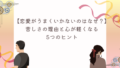 人間関係恋愛がうまくいかないのはなぜ?苦しさの理由と心が軽くなる5つのヒント 恋愛がうまくいかない理由に悩み、ひとりで苦しくなっていませんか?本記事では、恋愛がしんどくなる原因と、心が少し軽くなる5つのヒントをやさしく解説します。 2025.12.15人間関係恋愛・パートナー